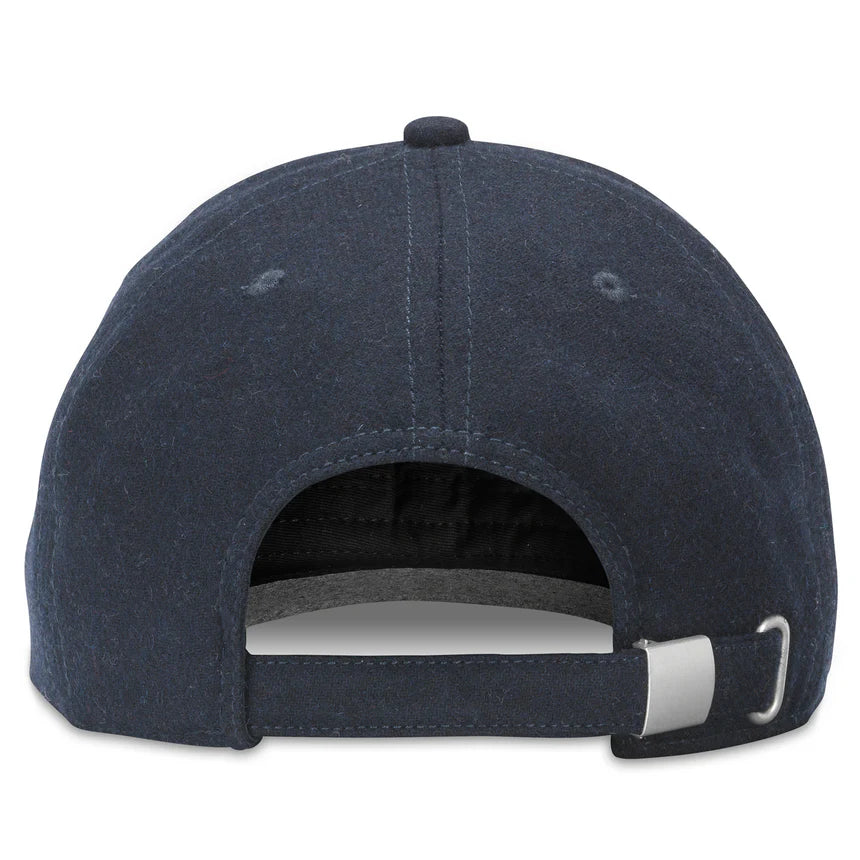 40% wool / 60% poly flannel 6-panel retro cap with soft light buckram crown and slight pre-curved visor. Front logo is lofted cotton thread embroidery. Features custom sew-in label identifying team logo inception inside of cap. Adjustable self-fabric back strap with matte finish metal buckle.