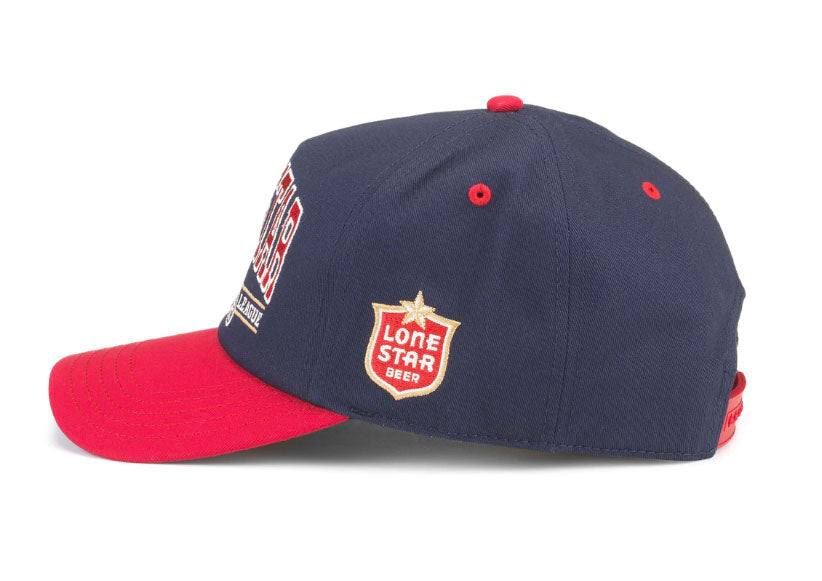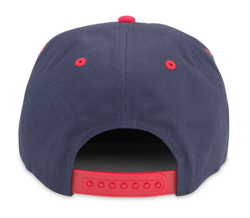 Washed Twill 5-panel with soft structured crown and slight curved visor. Braided nylon cord across seam and plastic snap closure. Front logo is merrowed twill patch or embroidery.